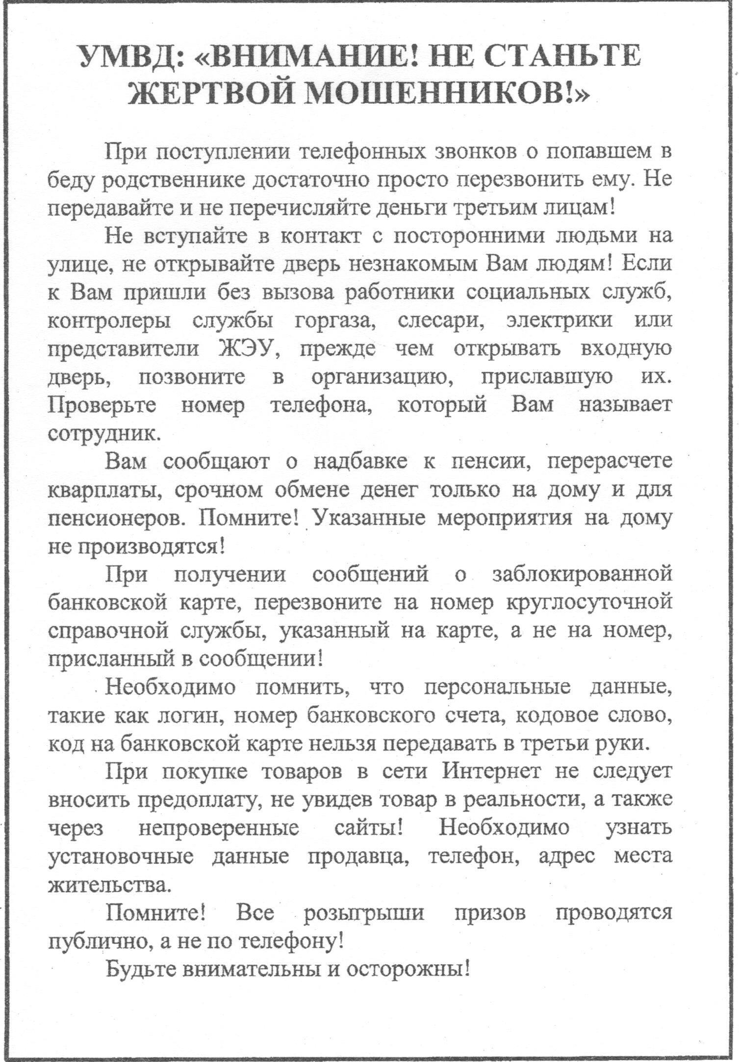 УМВД "ВНИМАНИЕ! НЕ СТАНЬТЕ ЖЕРТВОЙ МОШЕННИКОВ!"