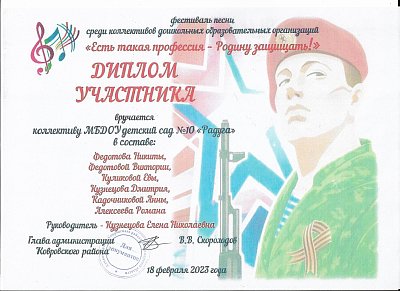 Участие МБДОУ детский сад № 10 "Радуга" группа "Солнышко" в фестивале песни среди коллективов дошкольных образовательных организаций "Есть такая профессия - Родину защищать!"