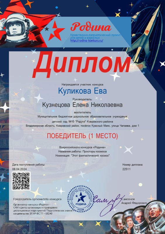 Дети группы "Солнышко" приняли участие в муниципальном конкурсе рисунков "Космос - это мы" Фетова Виктория - призер конкурса и во Всероссийском конкурсе "Родина" в номинации "Этот фантастический космос" (рисунок) Куликова Ева - победитель.