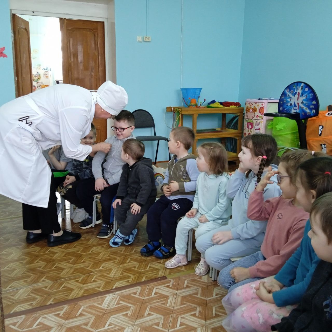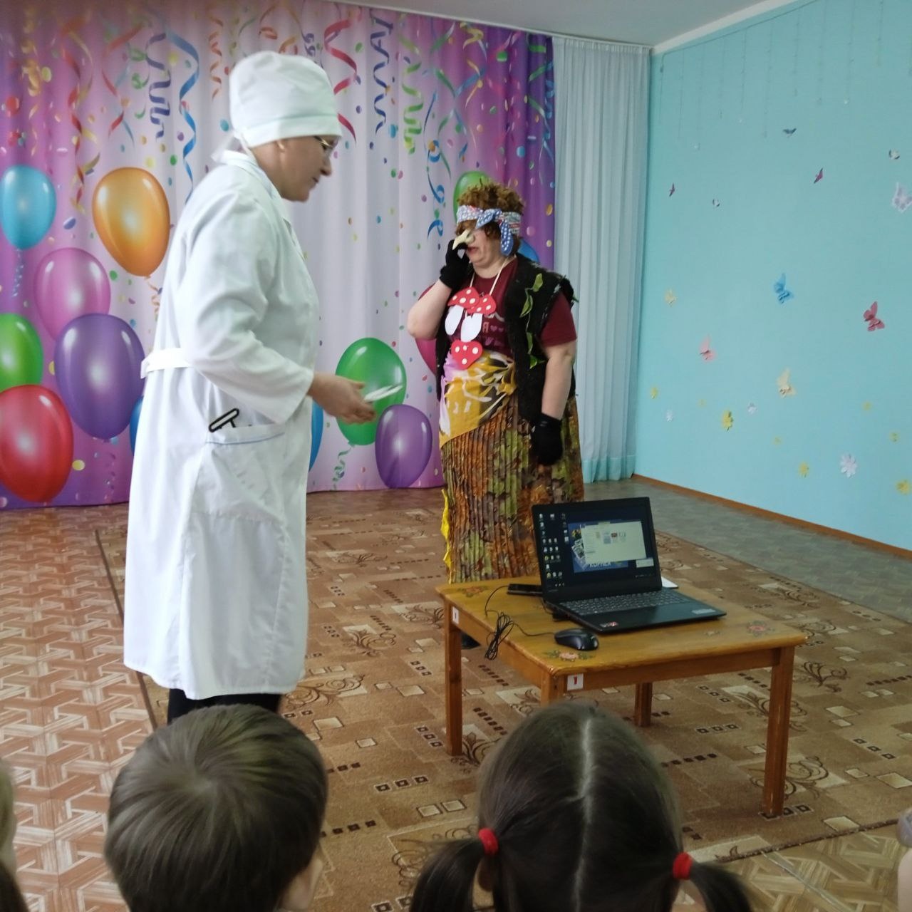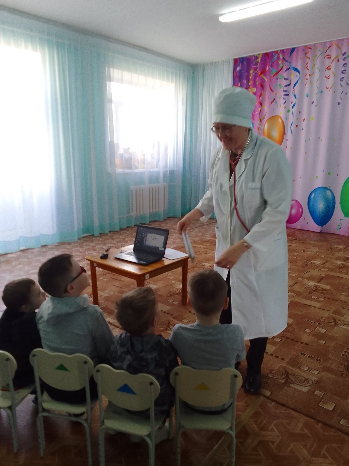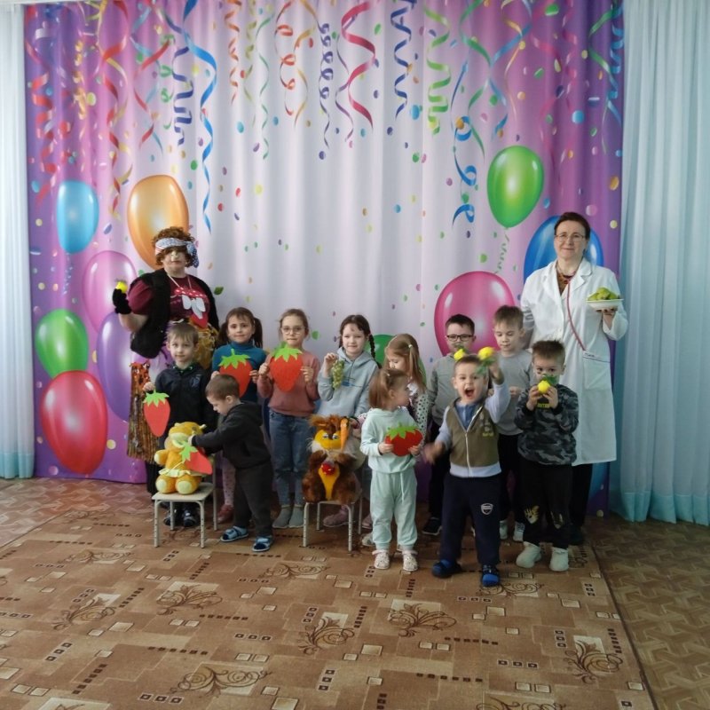 В конце Доктор и Баба-Яга угостили ребят вкусными витаминками-леденцами и полезными фруктами – грушами.