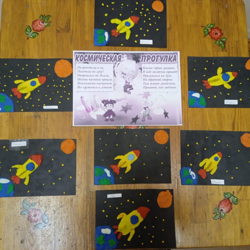 Для расширения кругозора в группе были использованы иллюстрации о планетах, спутниках, созвездиях. В беседах с педагогами дети узнали о человеке, первым покорившем космическое пространство - Ю.А. Гагарине, первой женщине космонавте - В.В. Терешковой, о том как четвероногие друзья человека проложили путь к звездам, о планетах больших и маленьких, об их свойствах. Свои знания и умения дети старшего возраста закрепили в своих творческих работах (кружок «Пластилинографии»), которые получились яркими и оригинальными.