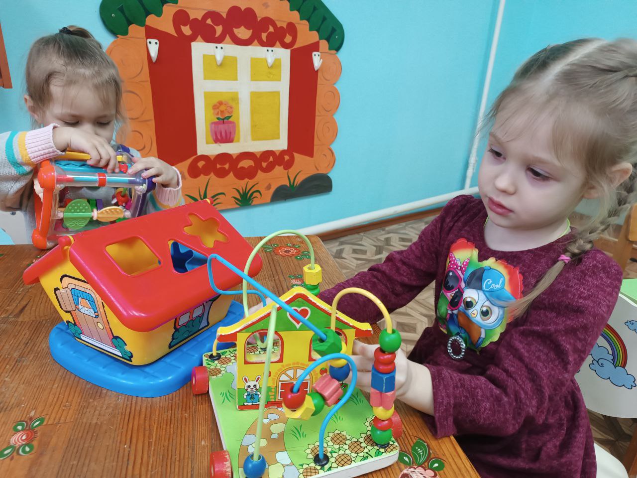 На занятии в ясельной группе «Ягодка» дети играли с различными развивающими игрушками, такими как лабиринт, сортер.