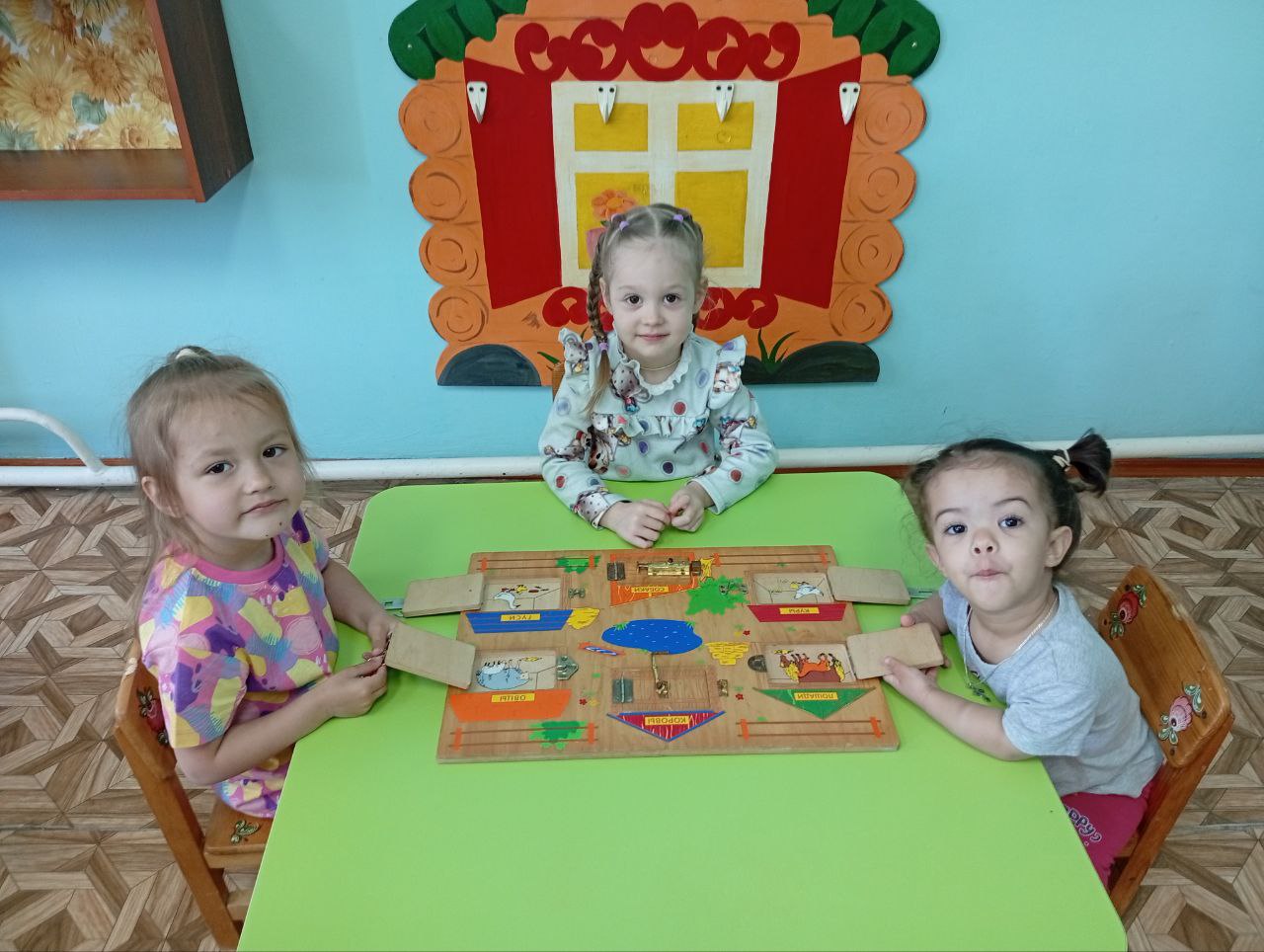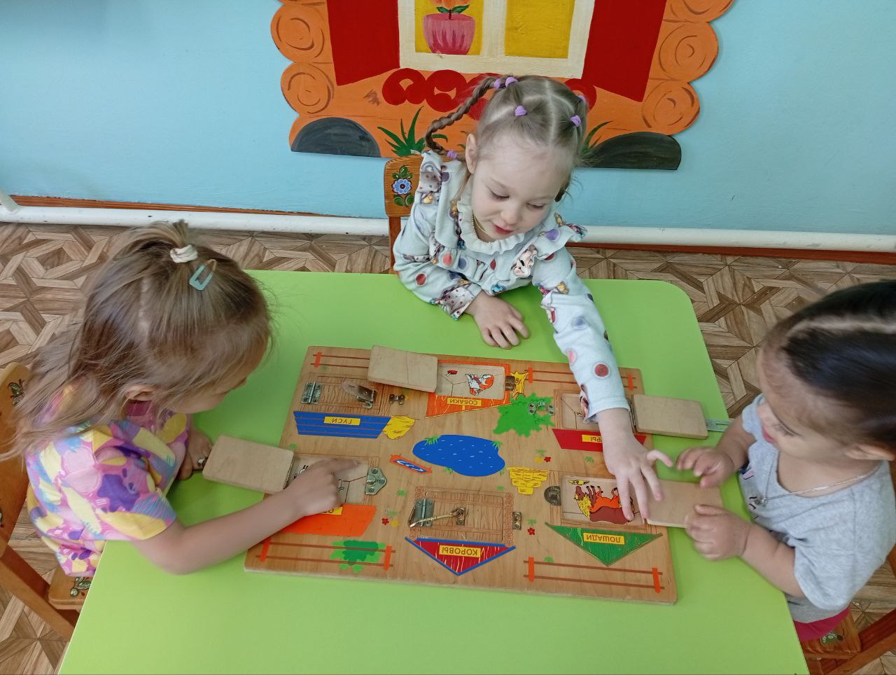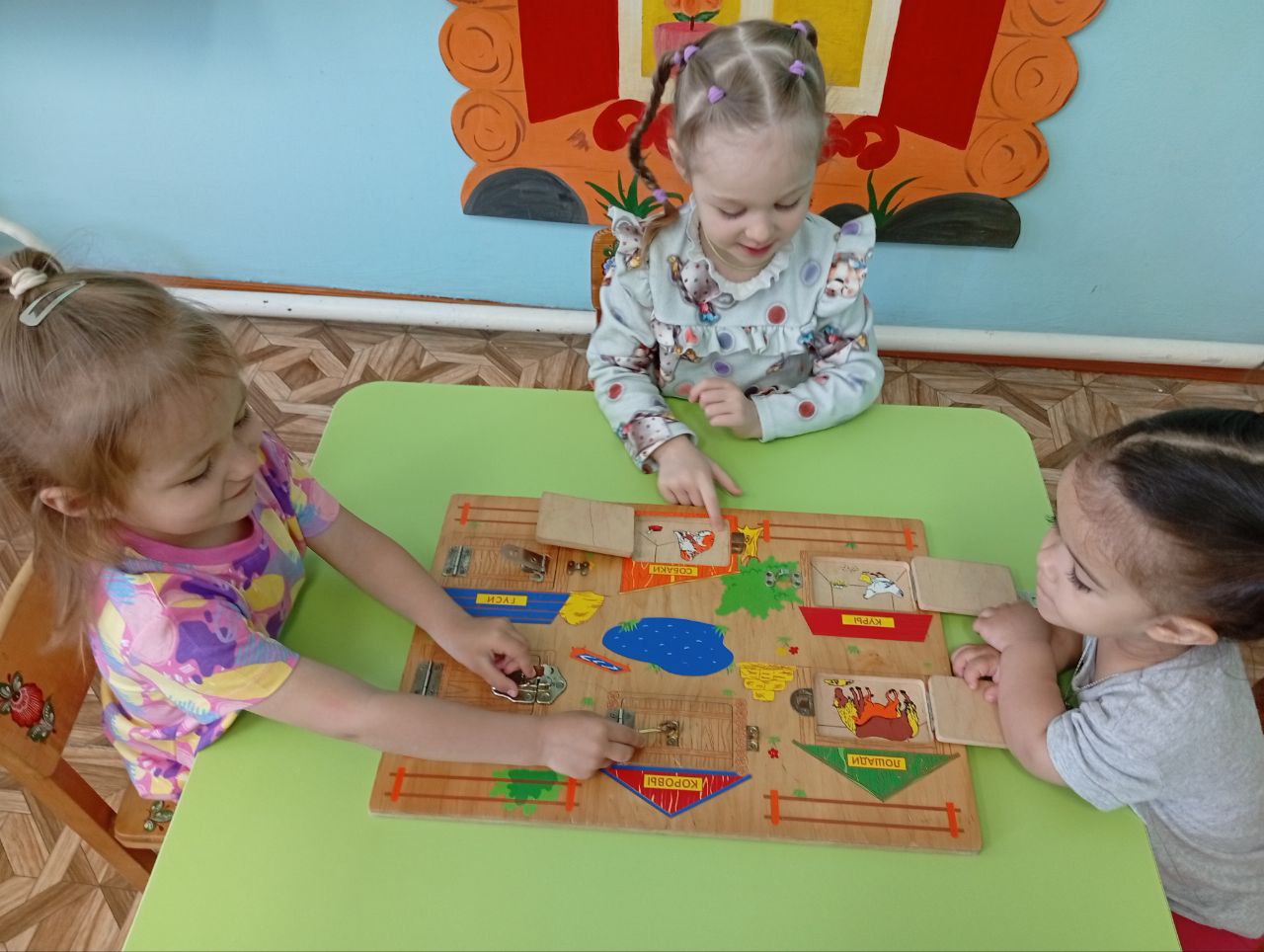 В группе "Ягодка" провели дидактическую игру - бизиборд"Домашние животные". Воспитанники повторили названия животных и места, где они живут.
